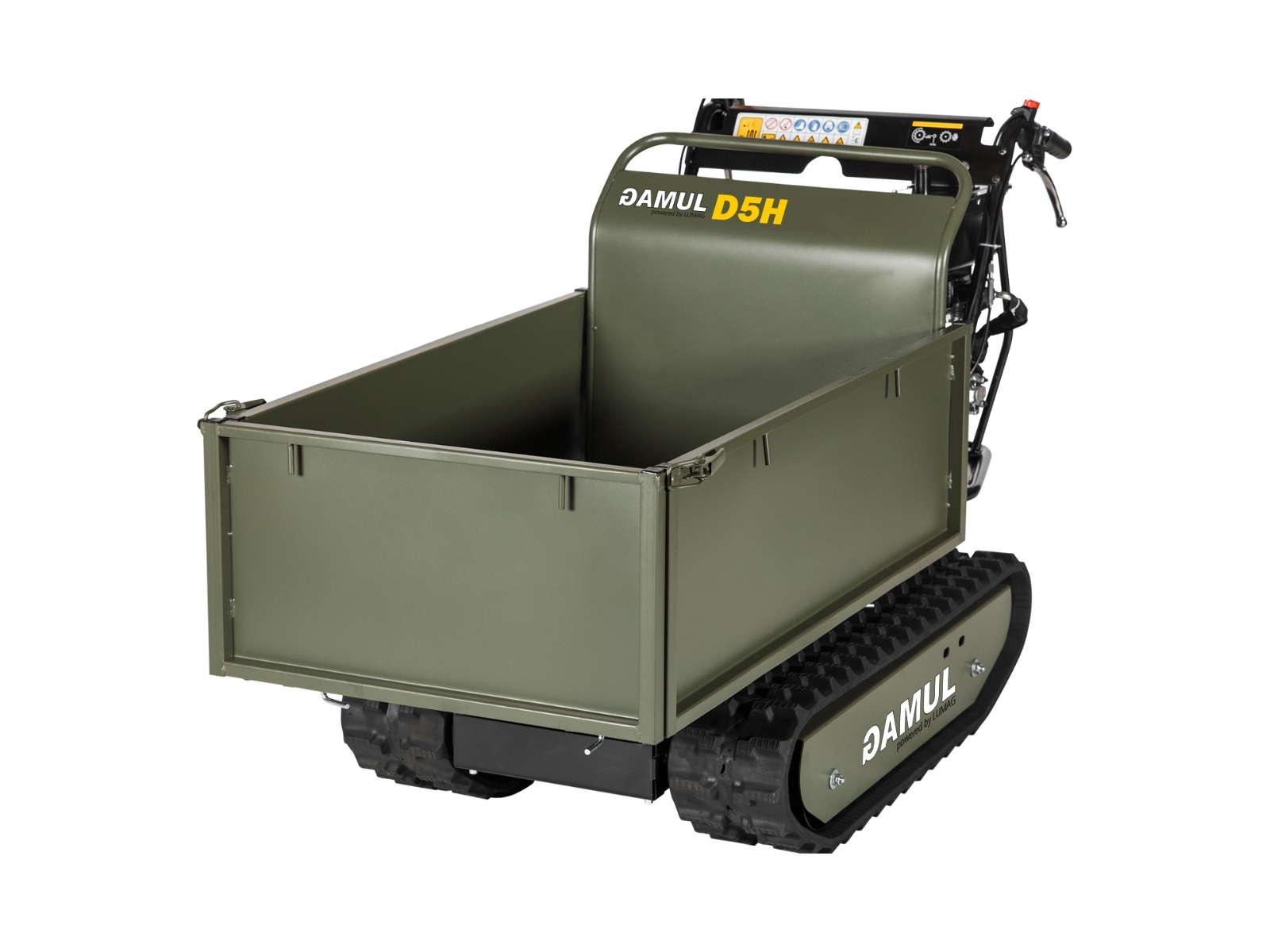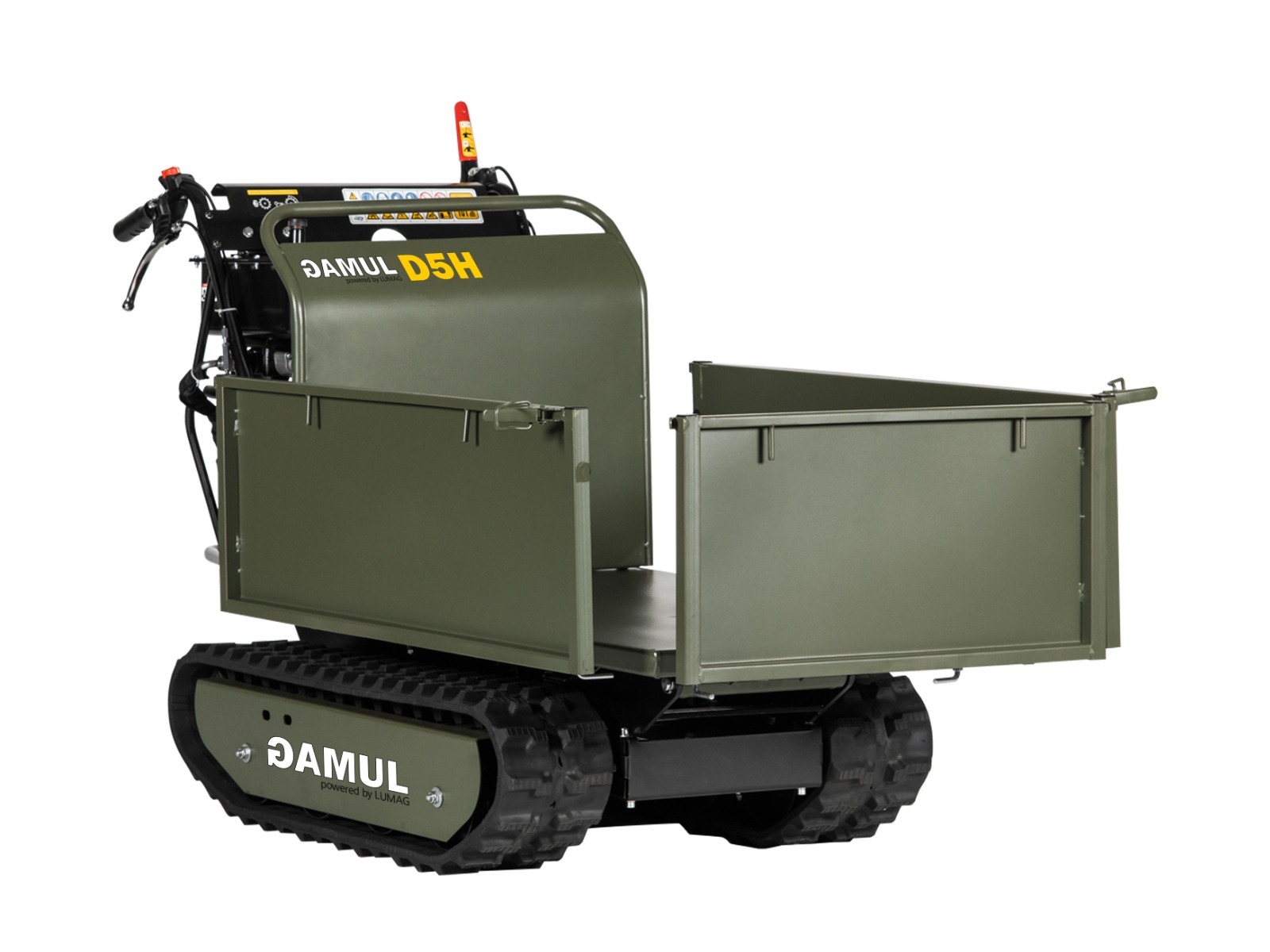 Benzínový mini pásový dumper GAMUL-D5H je ideálním pomocníkem pro všechny přepravní práce v širokém spektru odvětví. S nosností až 500 kg bez problémů přepraví sypký i kusový materiál, a to i v náročném terénu. Díky mimořádně úzké konstrukci a kompaktním rozměrům se GAMUL-D5H bezpečně dostane do cíle i přes úzké brány a chodníky. Hydraulická sklápěcí korba se sklopnými bočními stěnami umožňuje snadné vyprazdňování. Robustní ocelová konstrukce a výkonný hydraulický válec v kombinaci s jednoduchým, intuitivním ovládáním dělají z GAMUL-D5H ideálního pomocníka pro široké spektrum přepravních úkolů.