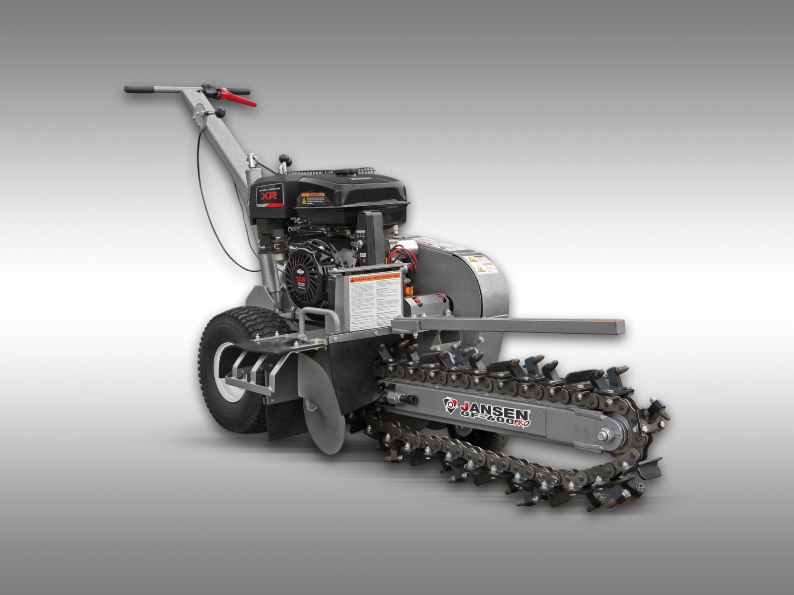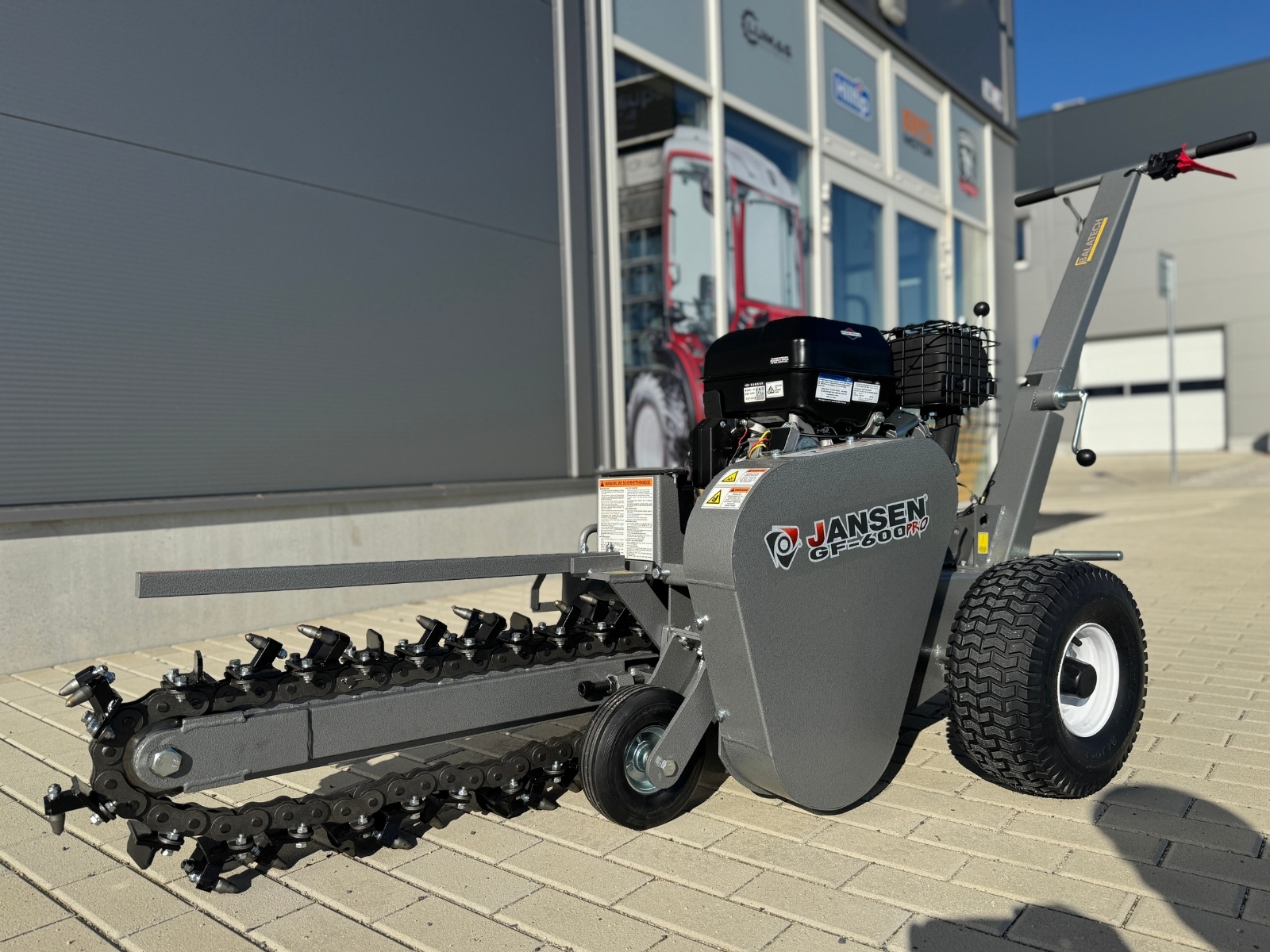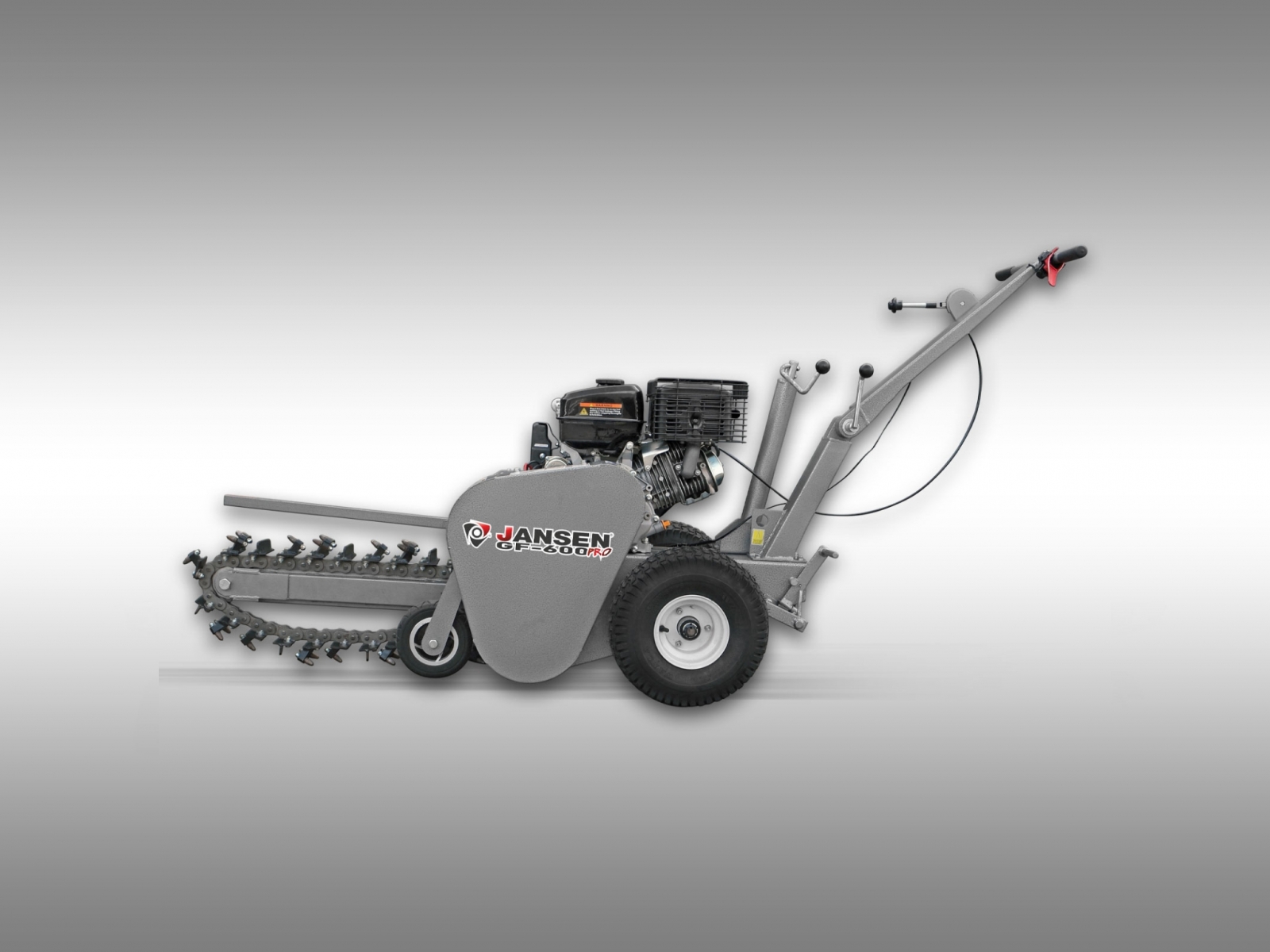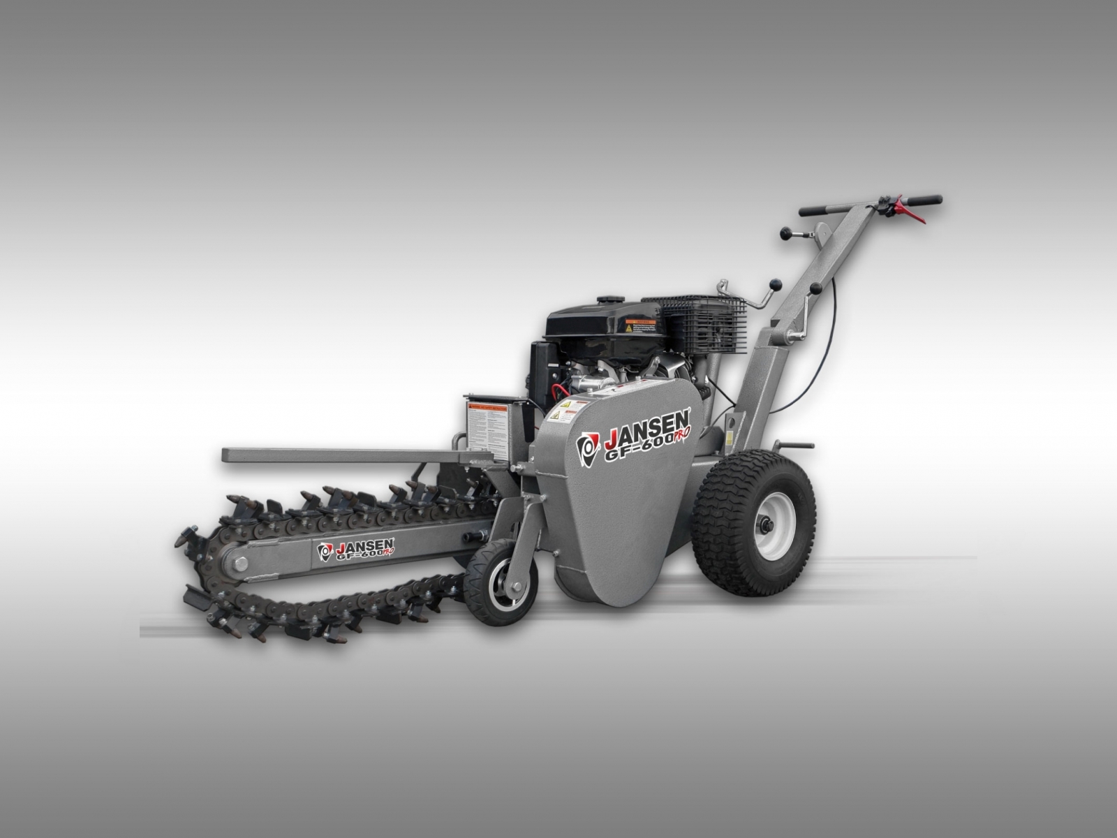 - Díky kompaktní konstrukci se světlou šířkou pouhých 95 cm se JANSEN ® GF-600pro snadno vejde přes zahradní brány nebo úzké vjezdy do dvorů. Nejenže ušetříte čas a peníze ve srovnání s pronájmem minibagru, ale také se vyhnete poškození vaší zahrady.